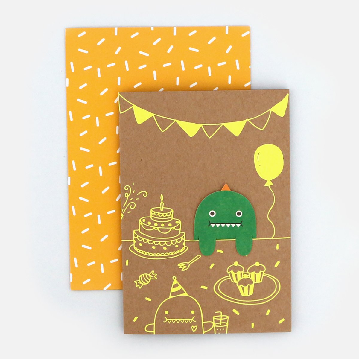 Ce joyeux dinosaure sait comment faire la fête ! Cette carte est parfaite pour dire bonjour, souhaiter un joyeux anniversaire ou bonne chance...