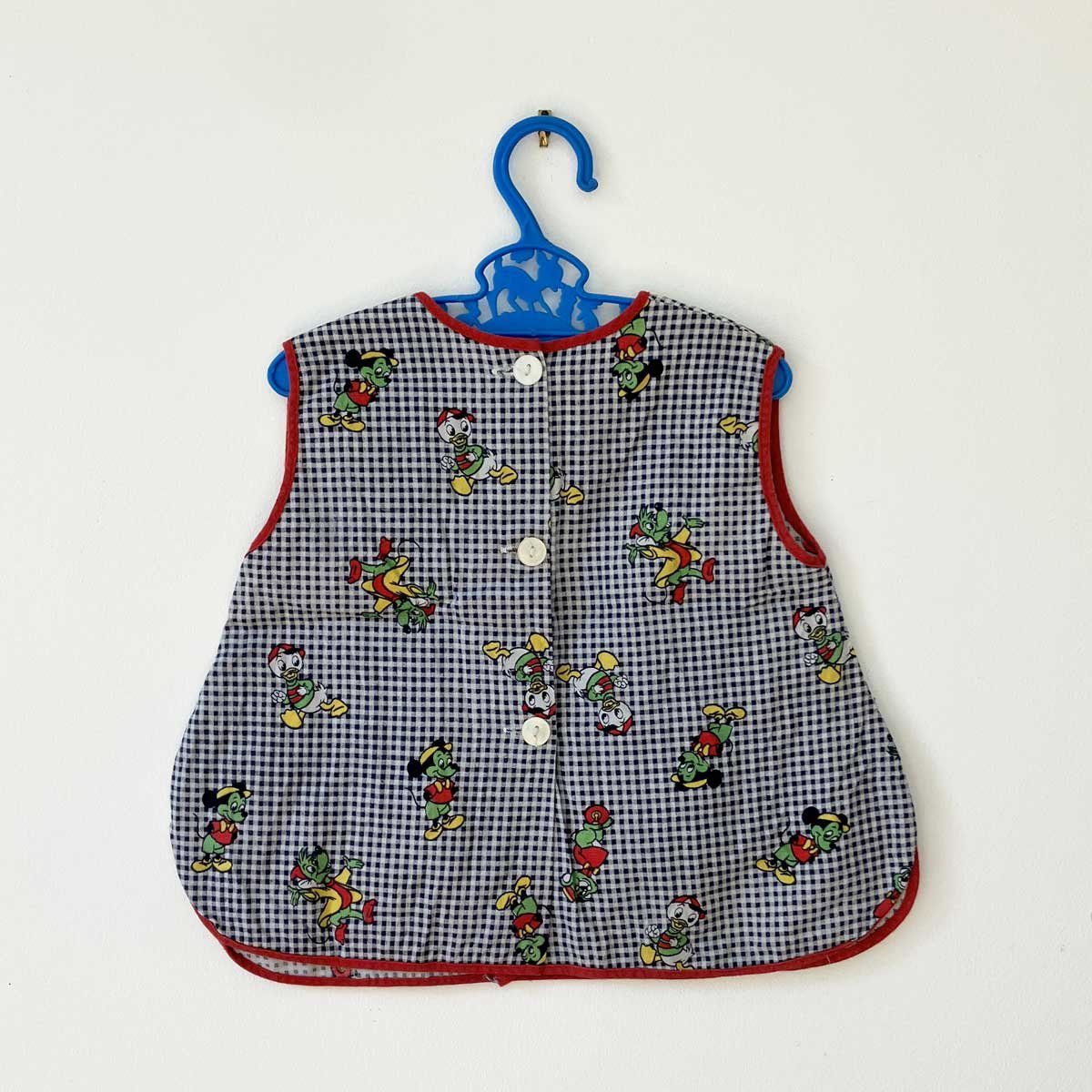 Tablier en coton avec imprimé vichy et personnages de Disney. Poche sur le devant et fermeture par boutons au dos. Seconde main des années 70.