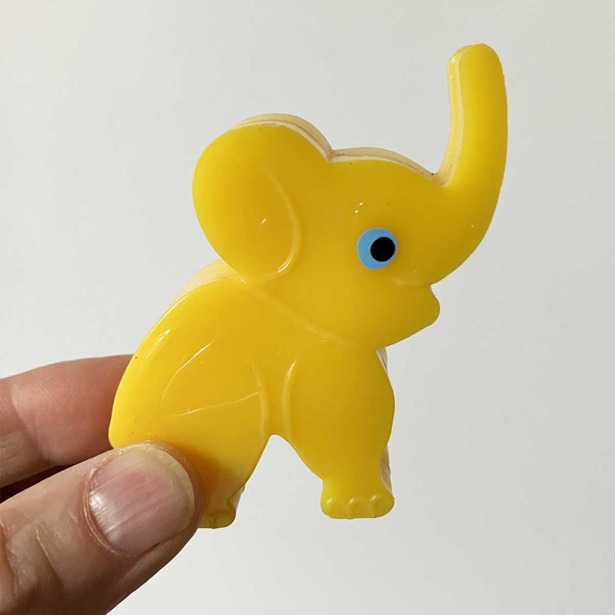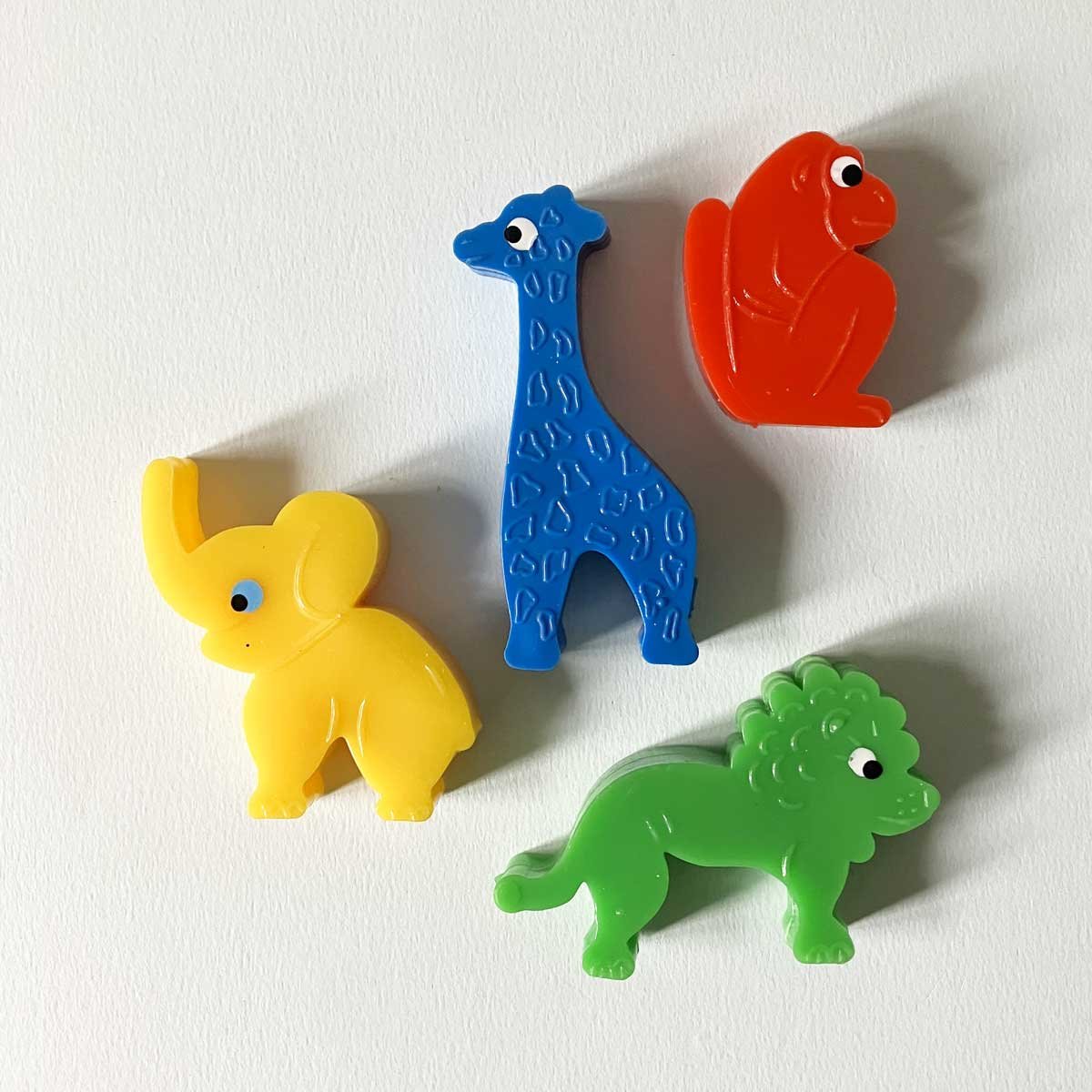 Jouet de la marque Spindler & Stelco, fabriqué en Allemagne de l’ouest. Le train en caoutchouc est composé d’une locomotive et de trois wagons qui transportent des animaux. Le singe, la girafe, le lion et l’éléphant peuvent être manipulés, transformant le train en jeu d’encastrement. Stock neuf des années 80.